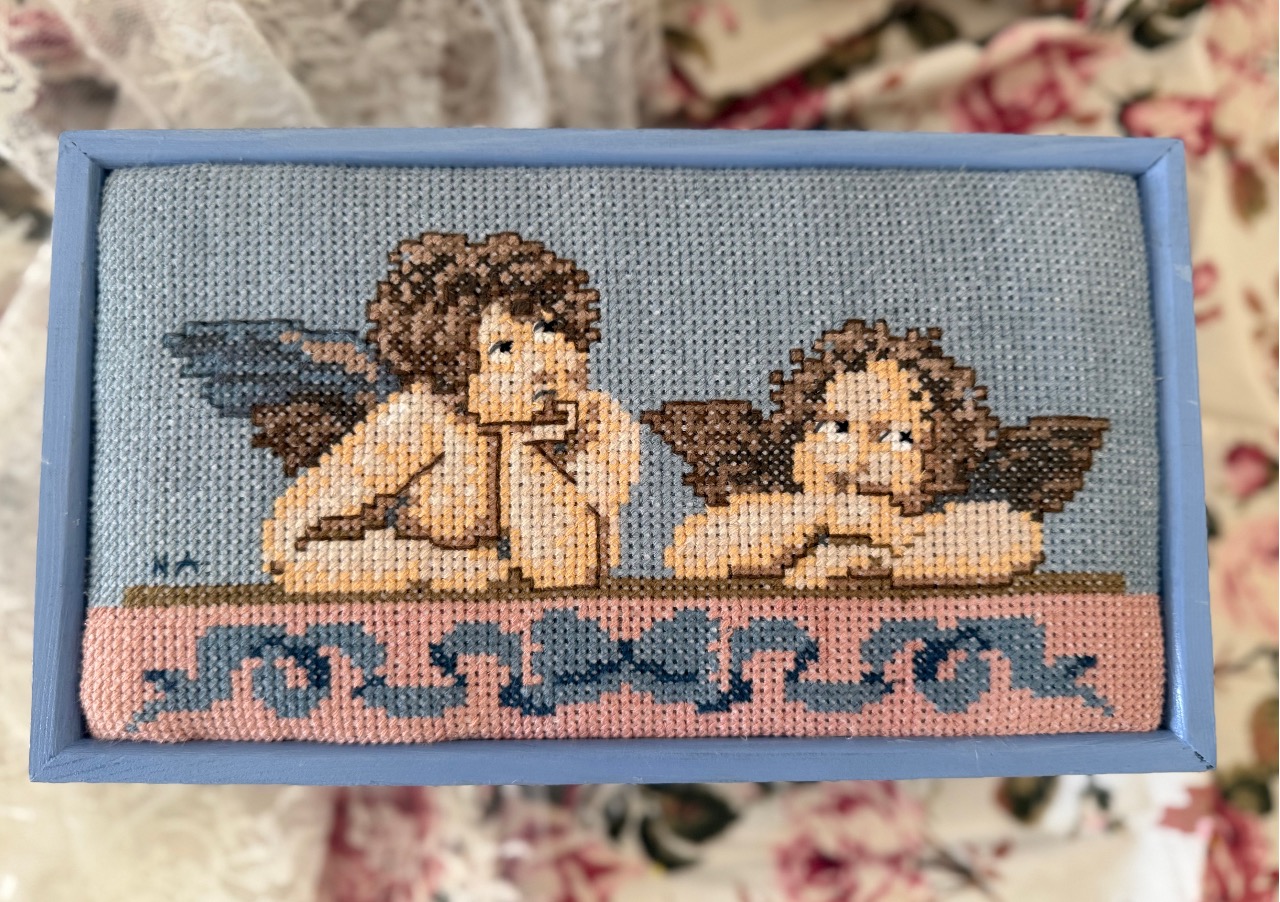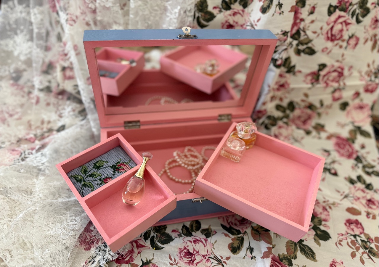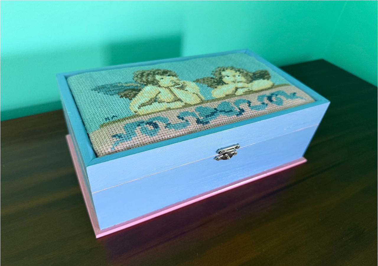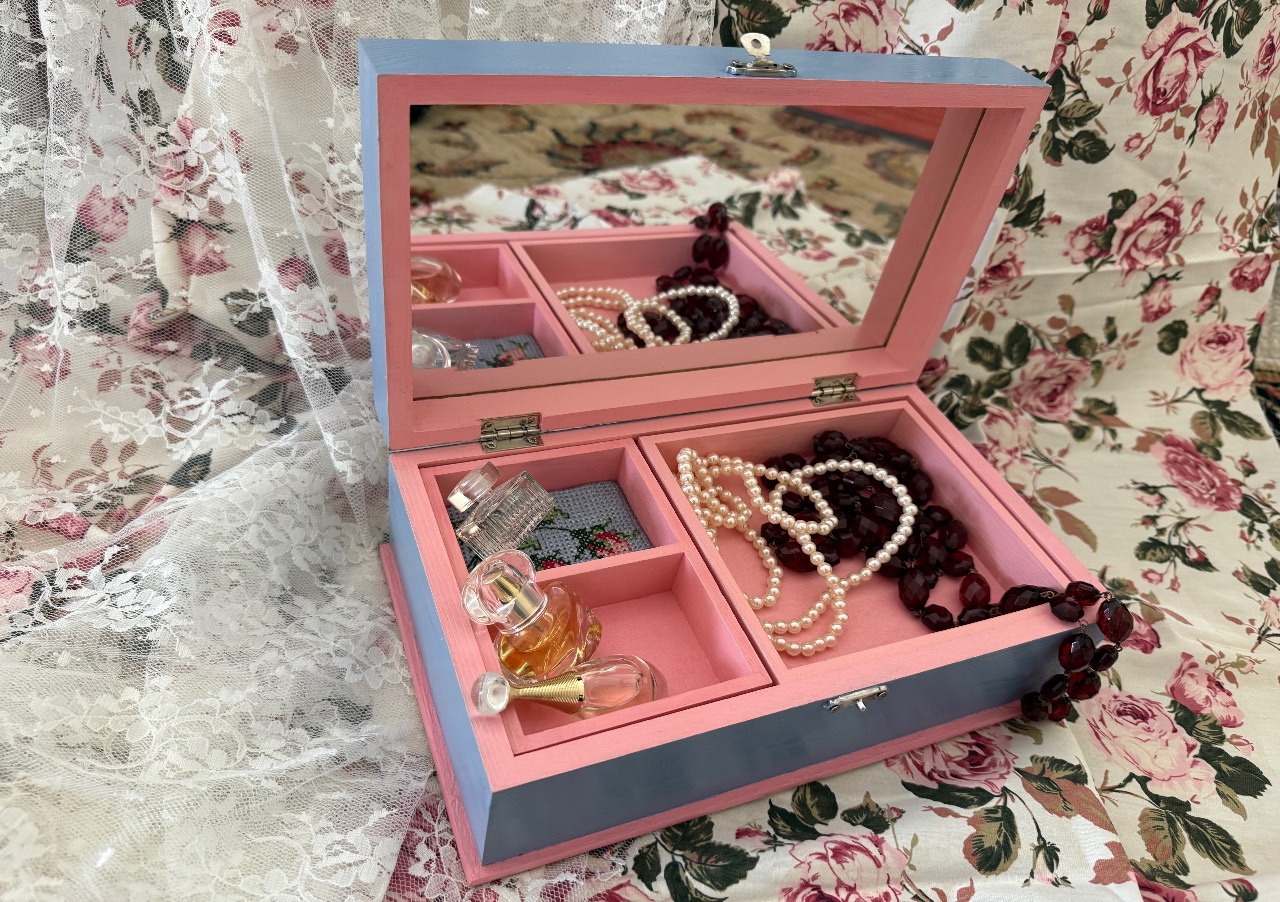 An absolutely beautiful wooden jewelry box with a big mirror! This exquisite piece features my hand embroidery of “Raffael’s Angels” and a delicate hand-embroidered “Blue Bow,” carefully added to the lid of the wooden box as a soft cushion. It will look stunning on your table while keeping your treasures neatly organized, thanks to its four (4) compartments and secure metal clasp.