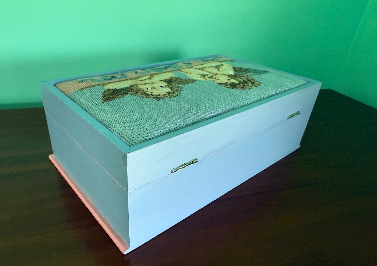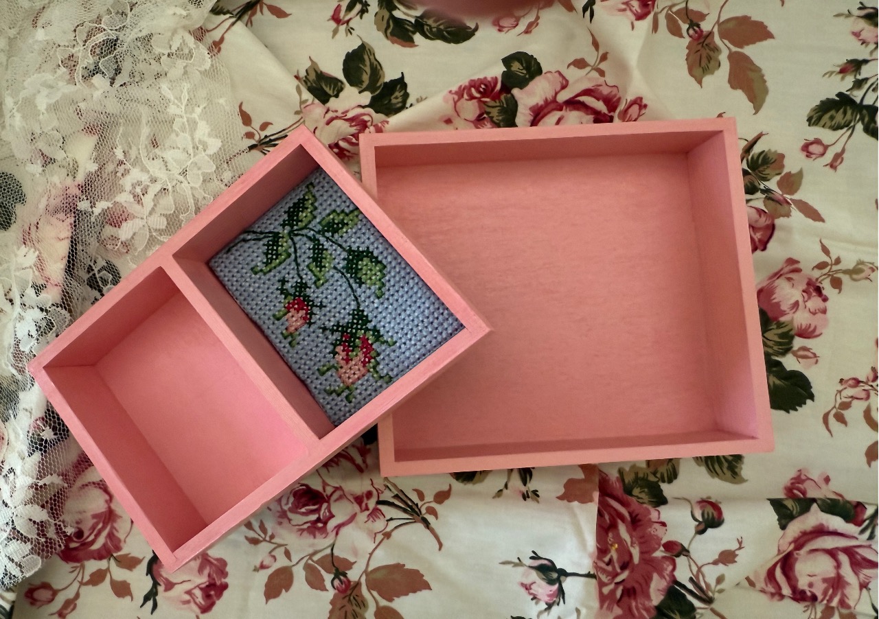 The exterior of the box is painted blue with a pink border, while the interior is soft pink, perfectly complementing the embroidery colors. I have also added a small hand-embroidered rose inside the box to complete its beauty. All the embroidery is done in counted cross stitch. The back of the box is painted with a black paint and the natural wood grain shows through the paint, adding depth and character to the piece.